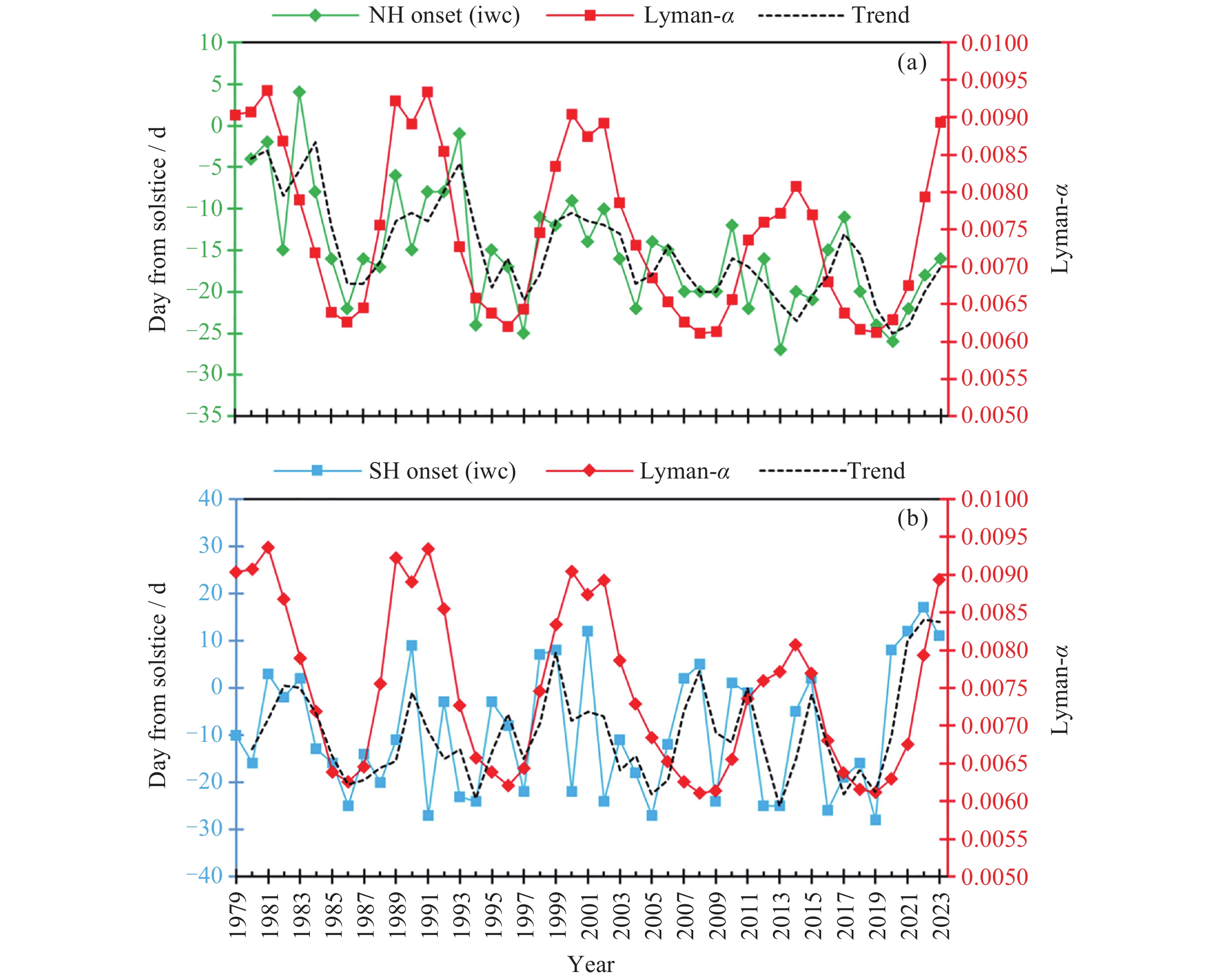 Figure  1.  Onset of PMC seasons from 1979 to 2023 in both northern and southern hemispheres respectively