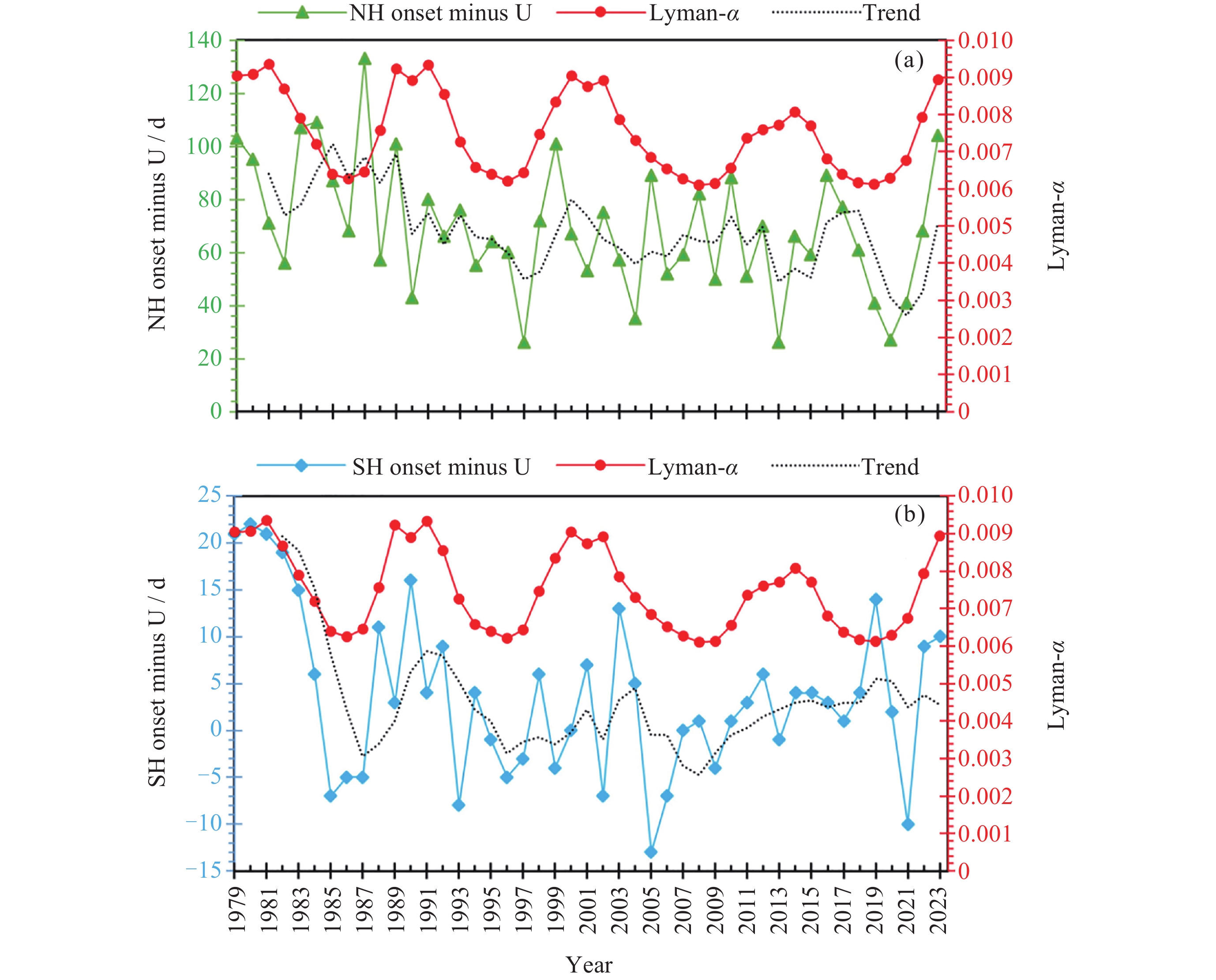 图  6  1979-2023年南北半球季节起始时间和纬向平均风反转时间的差值与太阳辐射的年际变化