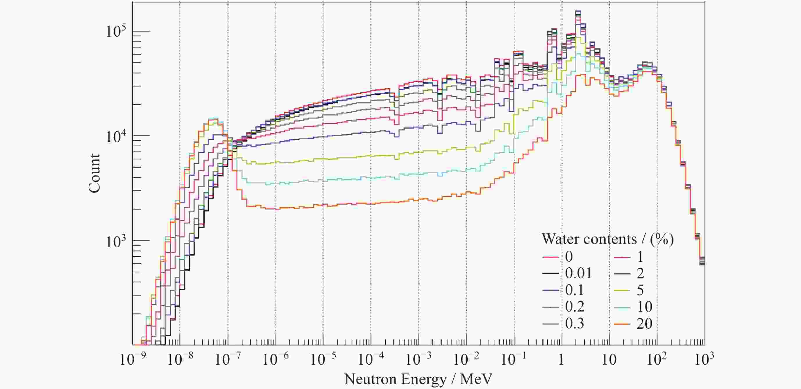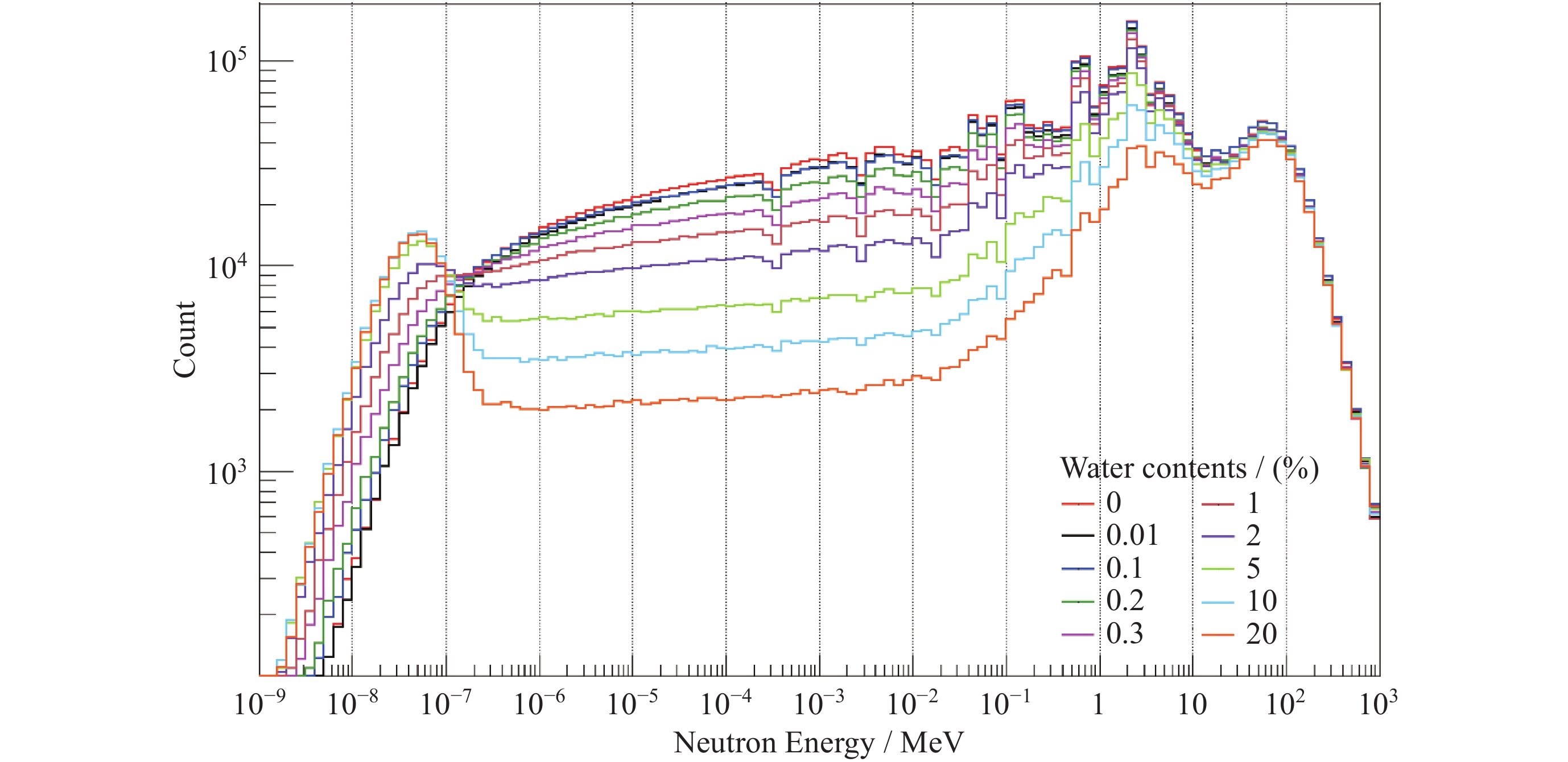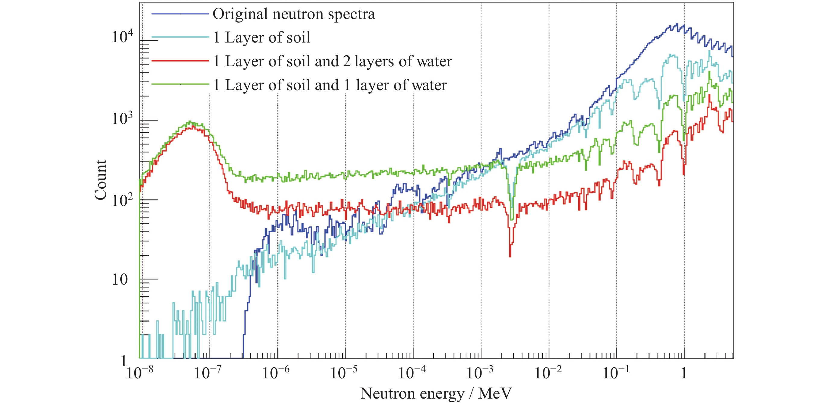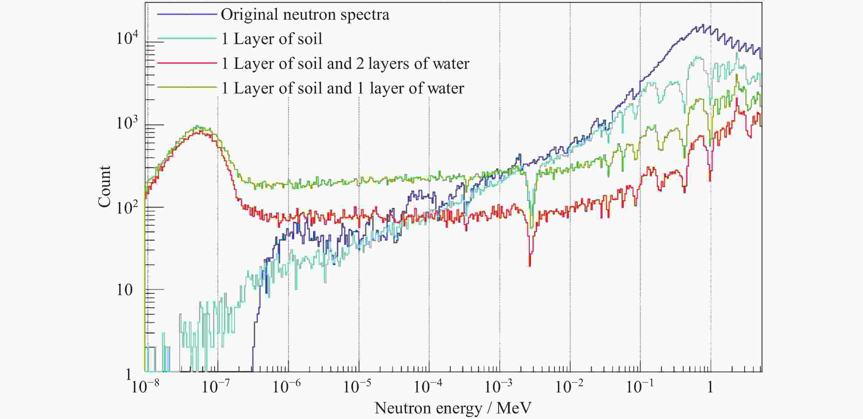 摘要: 嫦娥七号计划于2026年发射, 开展月球南极永久阴影区内的水冰探测是其重要的科学目标之一. 基于Geant4工具包构建嫦娥七号有效载荷月球中子伽玛谱仪(LNGS)的精细模型, 建立月表水含量与超热中子计数率之间的定量反演关系. 通过模拟银河宇宙射线(GCR)轰击月表产生的次级中子能谱, 结合中国散裂中子源(CSNS)的束流标定实验验证, 得到如下结果探测器建模的模拟效率与实验数据吻合良好(相对误差<6%); 探测器具备区分不同含水量土壤的能力; 月表水冰质量含量在0.01%~20%范围内时, 超热中子计数率随氢含量增加呈显著下降趋势, 其关系符合修正的Lawrence模型(R2=0.9993). 研究为嫦娥七号在轨数据解译提供了可靠的理论模型, 并为月球资源原位利用的探测技术发展奠定了基础.Abstract: The Chang’E-7 lunar mission, scheduled for launch in 2026, has the primary scientific objective of detecting water-ice deposits within the Permanently Shadowed Regions (PSRs) at the lunar south pole. Understanding the distribution and concentration of lunar water ice is crucial for both fundamental science and future In-situ Resource Utilization (ISRU). In this study, we developed a high-fidelity model of the Chang’E-7 Lunar Neutron and Gamma-ray Spectrometer (LNGS) payload using the Geant4 toolkit (Version 10.07.p02) and established a quantitative inversion relationship between lunar surface water content and epithermal neutron count rates. The LNGS model, constructed by importing a detailed CAD model into Geant4, was rigorously validated against neutron beam calibration experiments conducted at the China Spallation Neutron Source (CSNS) Back-n facility. The results are as follows. The detector model shows excellent agreement with experimental data across the 0.4 eV to 1000 eV energy range, with a relative error of less than 6%, confirming the accuracy of the mass modeling and simulation setup. LNGS exhibits significant capability in discriminating soils with varying water content, as evidenced by both simulation and ground-based validation experiments using layered soil and water samples. Within the water-ice content range of 0.01% to 20%, simulations of galactic cosmic ray (GCR) bombardment and subsequent neutron transport show that the epithermal neutron (400 ~700 keV) count rate decreases significantly with increasing hydrogen abundance. This relationship follows a modified Lawrence model with an exceptional coefficient of determination (R2 = 0.9993). The slight parameter differences compared to the original Lawrence model are attributed to the different simulation tools, lunar regolith composition models, and distinct detector designs and energy responses between LNGS and the Lunar Prospector neutron spectrometer. This study provides a robust theoretical framework and a specific, validated inversion model for interpreting Chang’E-7 orbital neutron data, directly enabling the mapping of hydrogen concentrations from measured count rates. It establishes fundamental technical support for the development of in-situ resource utilization technologies on the Moon and paves the way for high-precision assessment of water ice resources in the lunar polar regions.